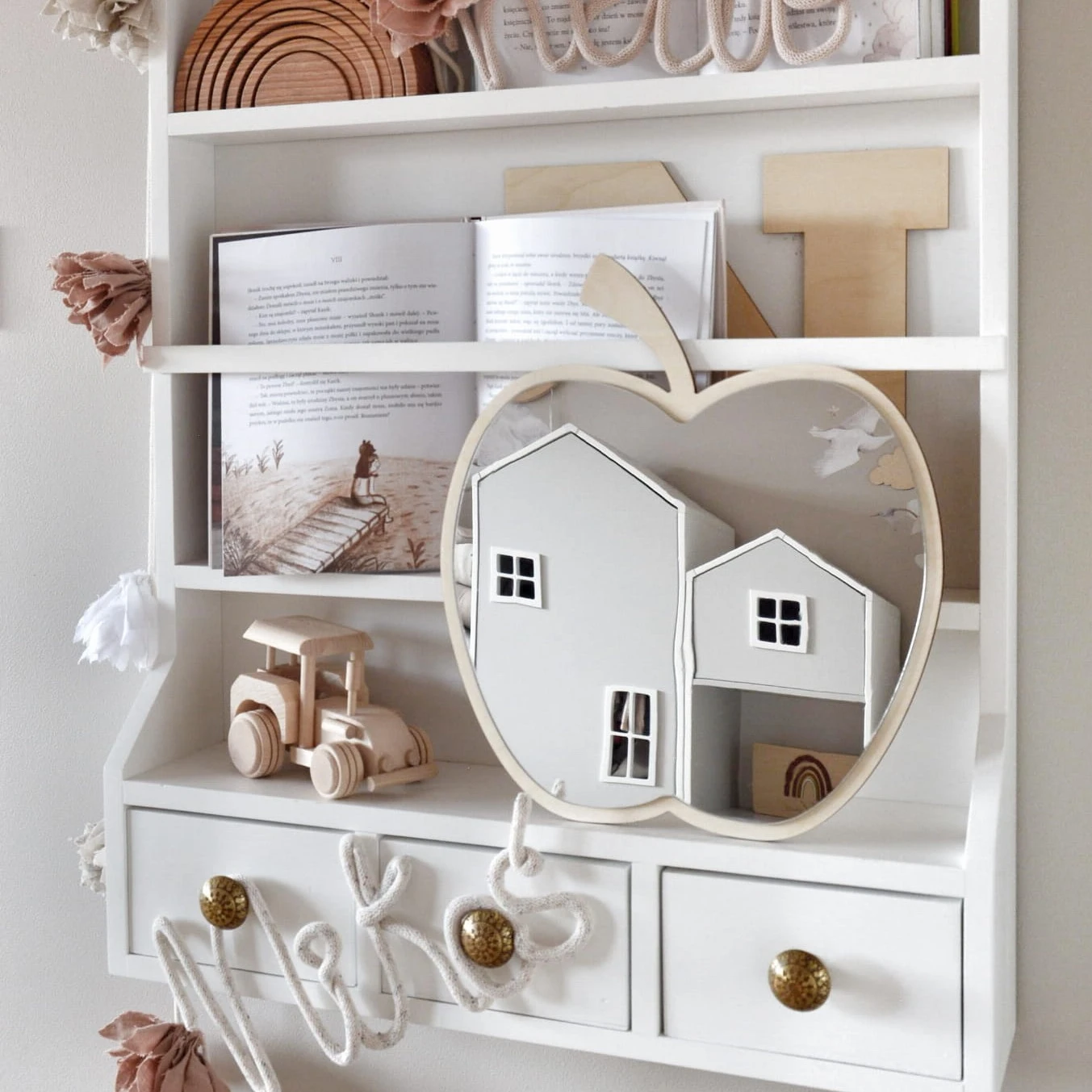 Urocze lusterko w kształcie jabłka, wykonane ze sztywnej sklejki o grubości 5 mm oraz lustrzanego akrylu 3 mm. Lusterko będzie pięknym dodatkiem w pokoiku dziecka. Akryl to tworzywo sztuczne, które jest lekkie i nietłukące. Dlatego też nasze lusterka są w 100% bezpieczne i mogą bez problemu pełnić funkcję lusterka w pokoju dziecka.