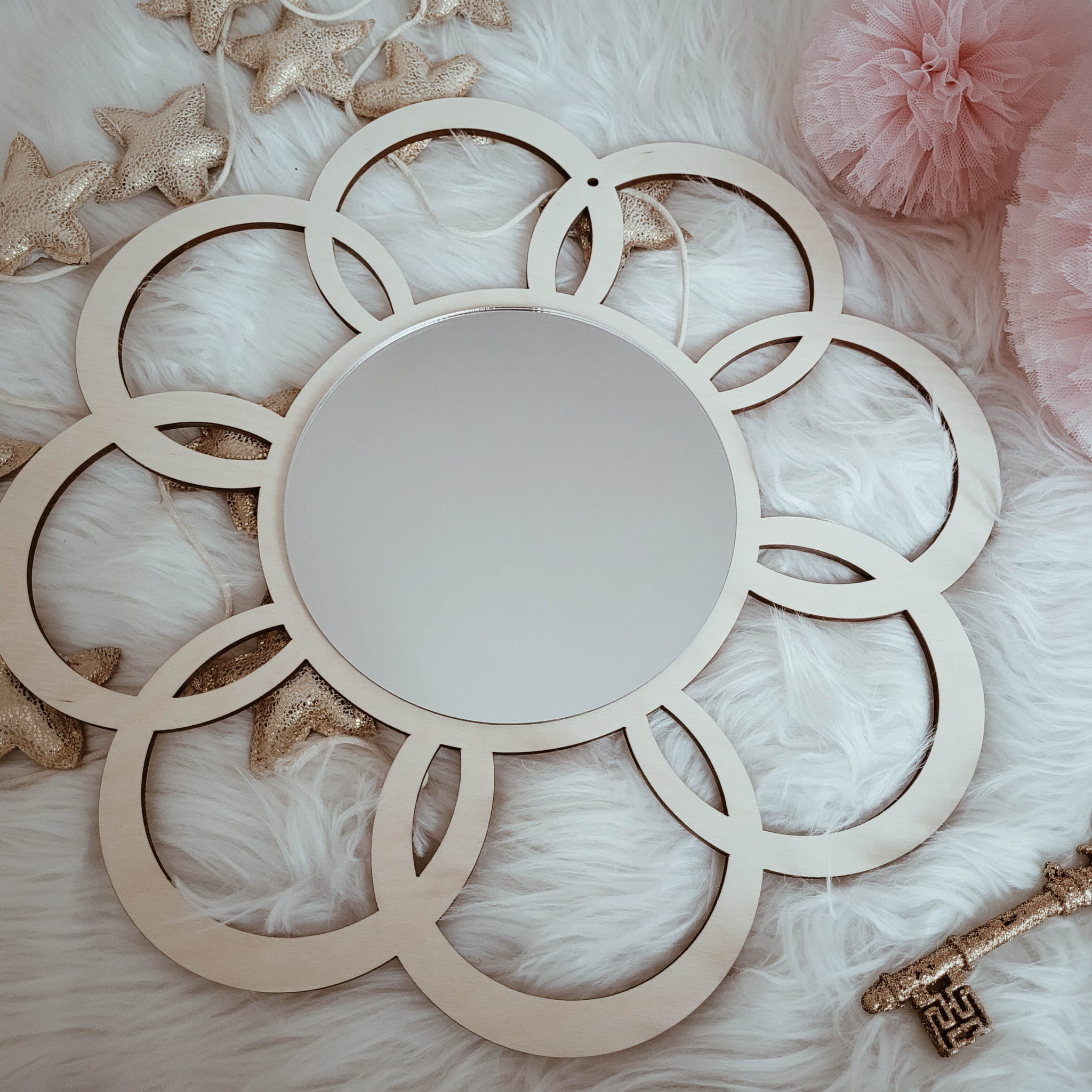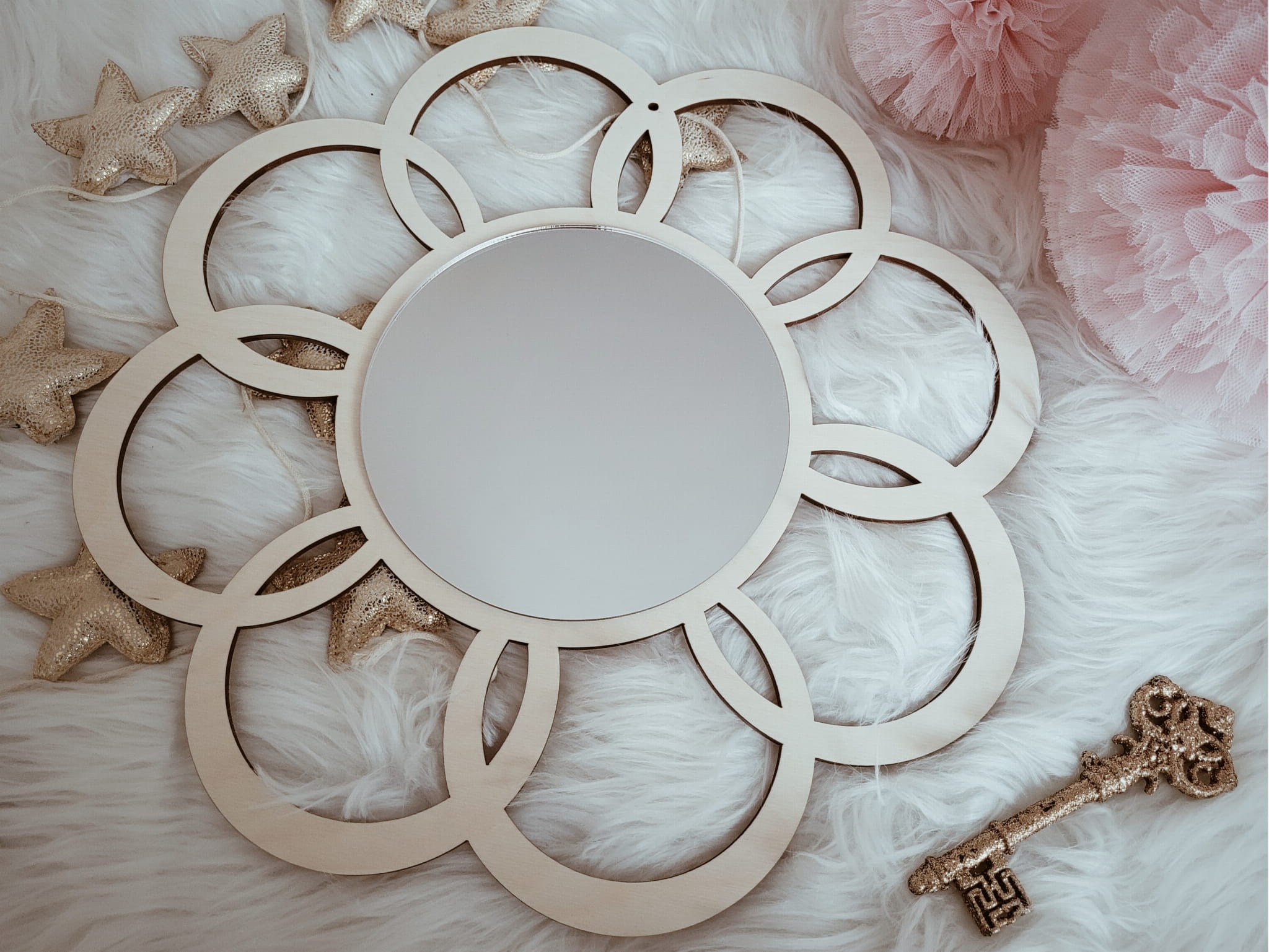 Urocze lusterko w kształcie kwiatka, wykonane ze sztywnej sklejki o grubości 5 mm oraz lustrzanego akrylu 3 mm. Lusterko będzie pięknym dodatkiem w pokoiku dziecka. Akryl to tworzywo sztuczne, które jest lekkie i nietłukące. Dlatego też nasze lusterka są w 100% bezpieczne i mogą bez problemu pełnić funkcję lusterka w pokoju dziecka.