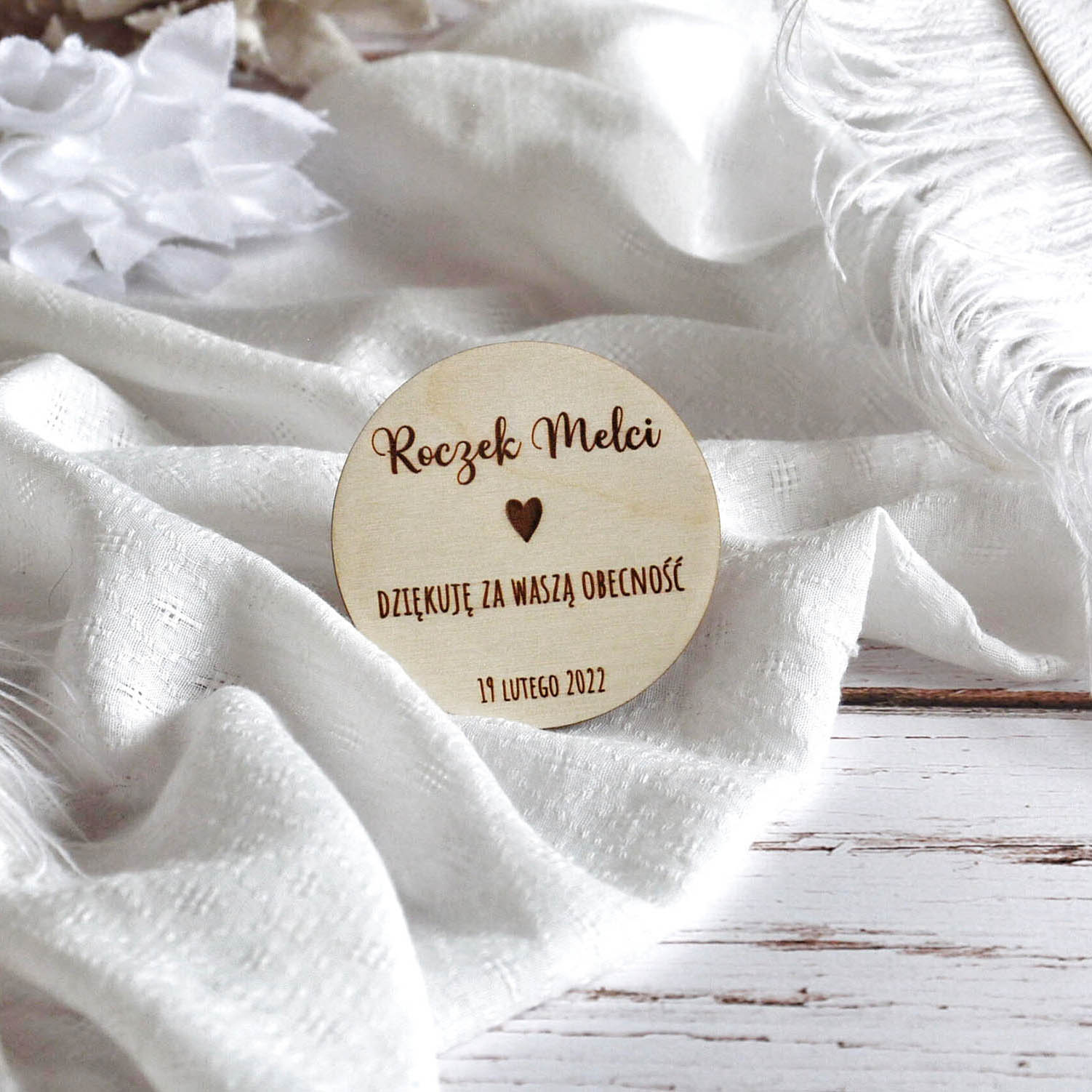 Podziękowanie dla gości w formie drewnianego magnesu z personalizowanym grawerem oraz datą.